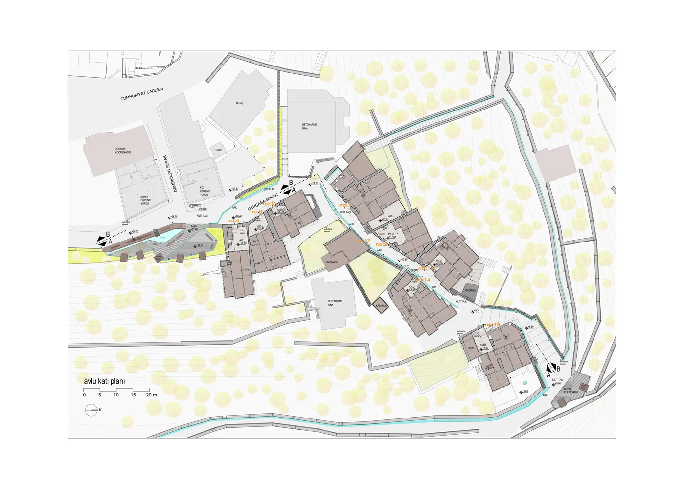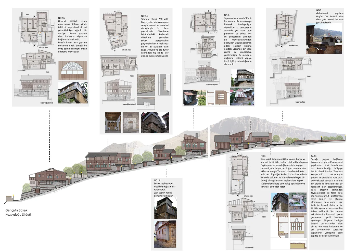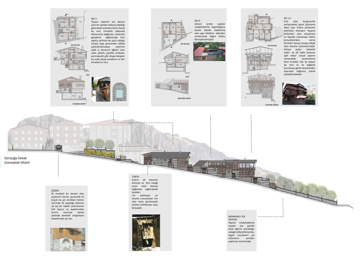 Sokak iyileştirmesi kapsamında 11 evin restorasyon projesi hazırlanmıştır. Öncelikle geleneksel evlere eklenen ve yapı karakterini zedeleyen elemanlar kaldırılarak özgün detaylarıyla yeniden çözümlenmiştir. Evlerin en acil ihtiyacı olan mutfak ve banyo donanımları ile ısıtma sistemleri günümüz koşulları çerçevesinde yeniden düzenlenmiştir. Çağdaş donanımlarla istenen konfor şartları sağlanan bakımsız durumdaki çoğu ev yaşanabilir hale getirilmiş, böylece bölgesel kimliğin sürekliliğine katkı yapılması amaçlanmıştır.