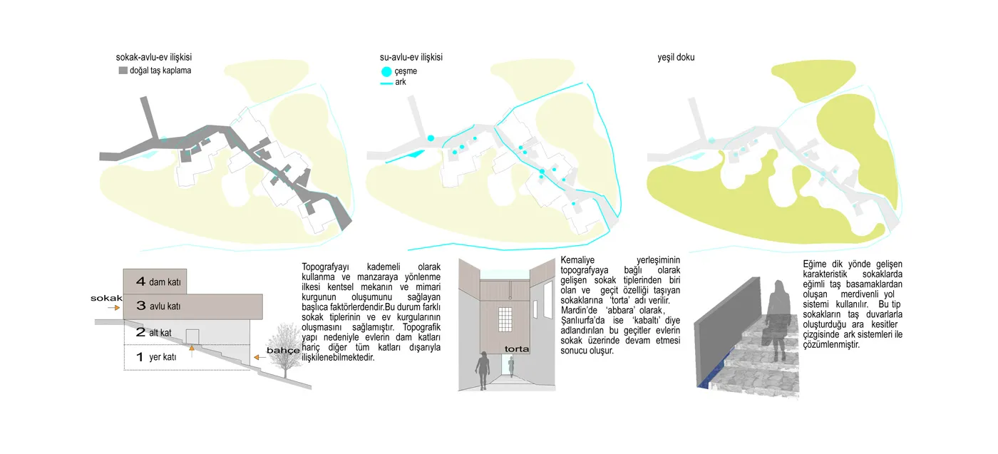 Topografyayı kademeli olarak kullanma ve manzaraya yönlenme ilkesi kentsel mekanın ve mimari kurgunun oluşumunu sağlayan başlıca faktörlerdendir. Bu durum farklı sokak tiplerinin ve ev kurgularının oluşmasını sağlamıştır. Topografik yapı nedeniyle evlerin dam katları hariç diğer tüm katları sokak-avlu-bahçe ile ilişkilenebilmektedir.