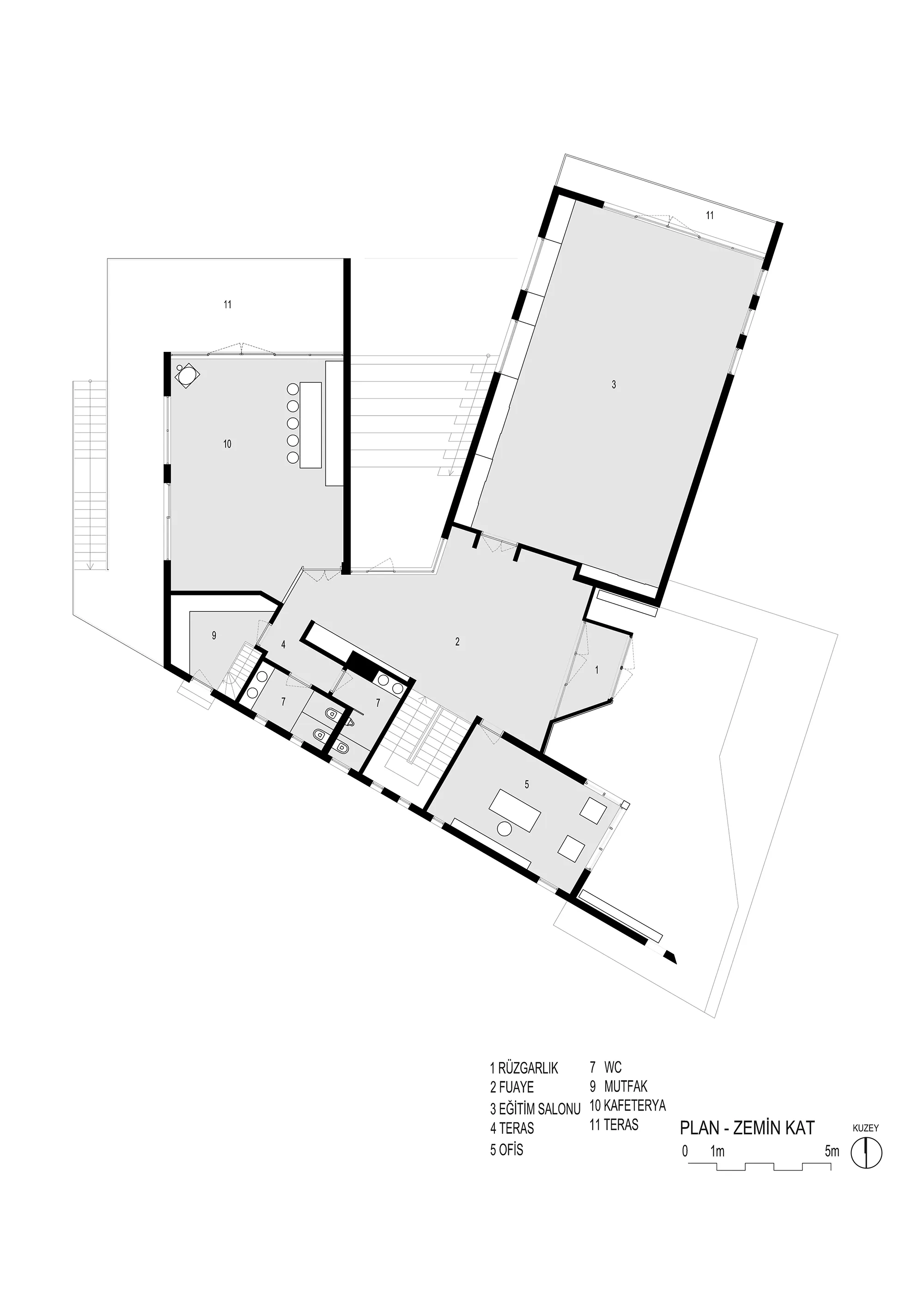 Plan kurgusunun temel belirleyicileri çevresel, iklimsel veriler ile manzara faktörüdür. Programın ana mekanları manzaraya doğru yelpazelenerek açılır ve kullanıcılara farklı panoramalar sunar. Gün ışığı kullanımı hem manzara yönlerine doğru açılan ana cephe boşlukları, hem de çatı pencereleri ile üst seviyeye çıkarılmıştır.