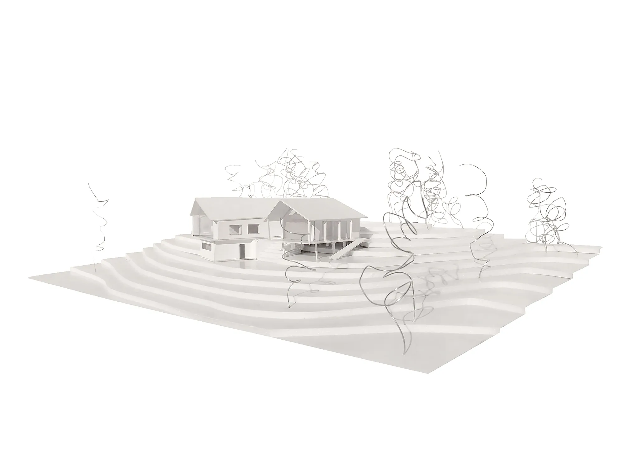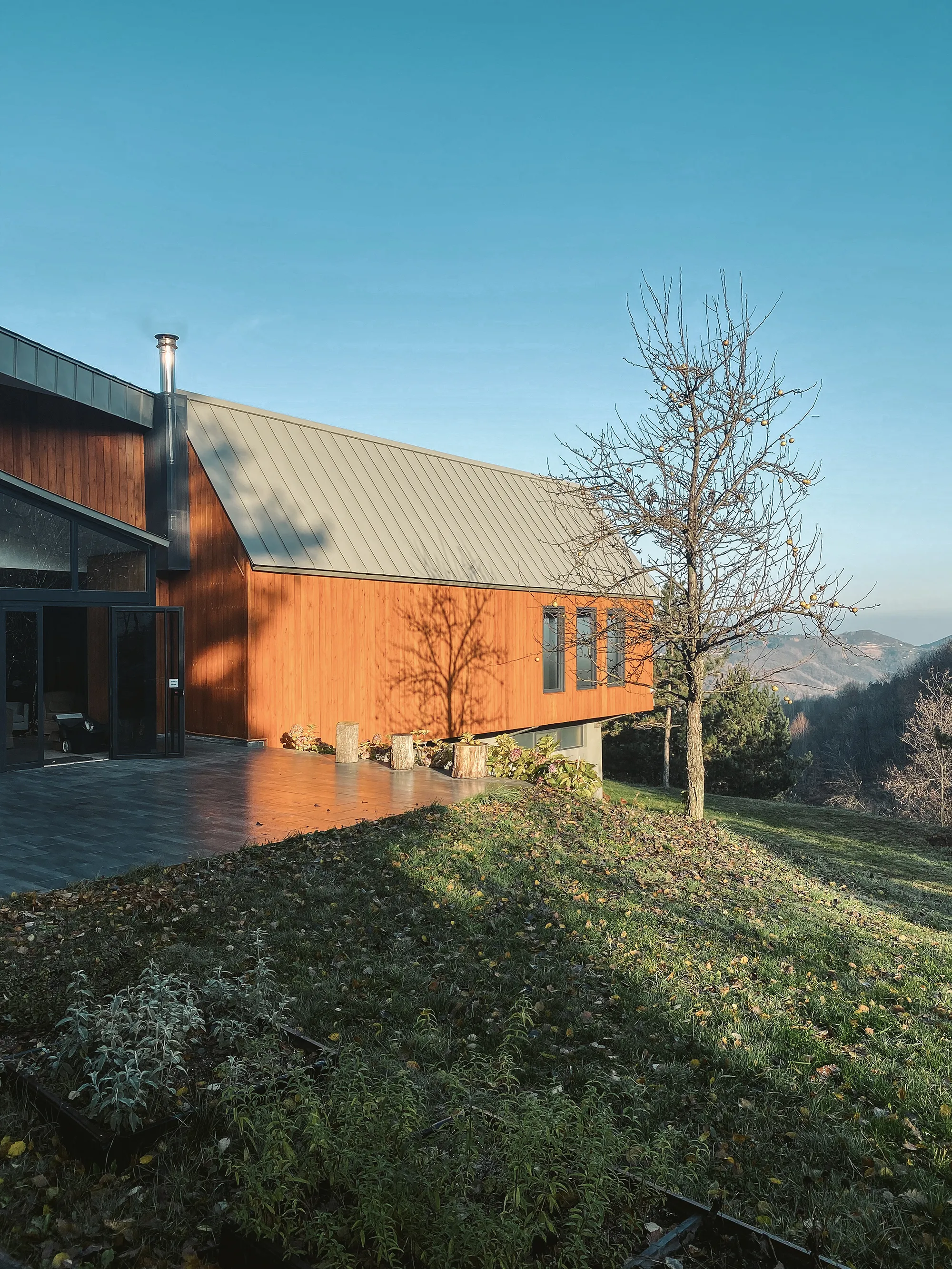 Yapı, arsanın üst kotlarında panoramik manzaraya hakim bir noktada konumlandırılmıştır. Doğal peyzaja uzanarak yakın çevre ile maksimum etkileşim içinde olması amaçlanmıştır. Yapıya yaya yaklaşımı ahşap lavanta kurutma hacimlerinin tanımladığı yürüme-dinlenme hattından sağlanmıştır. Böylece giriş hattı fiziksel bir ize ek olarak koku unsuru kullanılarak pekiştirilmiştir. Topografyanın hareketine eşlik ederek kısmen zeminden kopan yapı, açık amfi ve teraslar ile zemine tekrar bağlanır. Bu durum hem farklı kotlardan erişimi mümkün kılar hem de kullanıcılara yapının dış çeperlerinde farklı deneyim imkanları sunar.