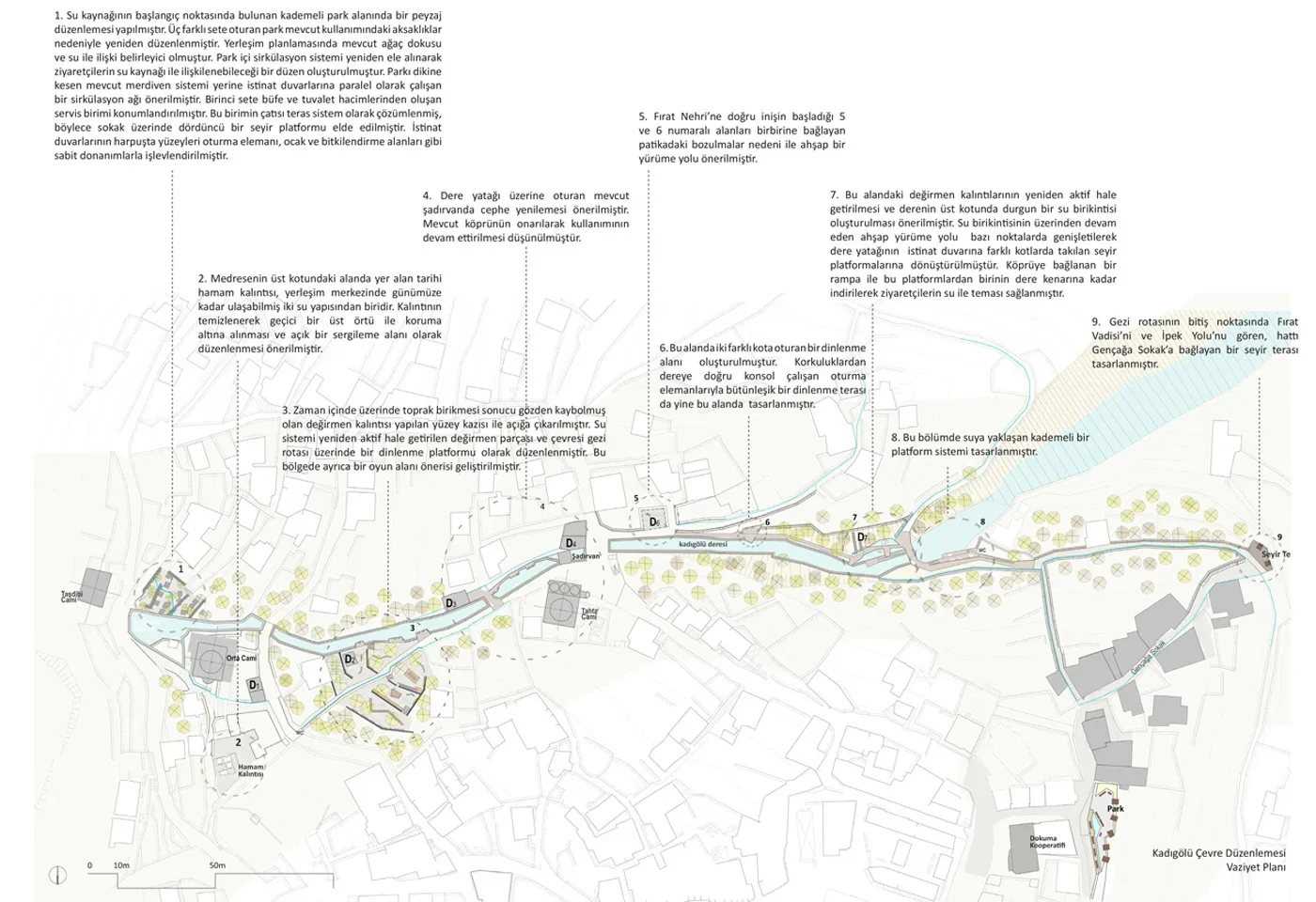 Proje temelde kültürel ve doğal çevrenin gözlenebileceği bir gezi rotası olarak kurgulanmıştır. Taşdibi ve Tahta camileri arasındaki yerleşim alanı kültürel mirasın, Fırat Nehri’ne doğru inilen yoğun yeşil bölge ise doğal ortamın deneyimlenebileceği bir yürüyüş rotası olarak ele alınmıştır. Gezi rotası 650 metre uzunluğunda olup; başlangıç ve bitiş noktaları arasında 90 metre kot farkı bulunmaktadır. Zaman içinde yapılan niteliksiz müdahalelerle özgün dokusu zedelenmiş olan bölgenin, bir dizi yenileme, koruma ve onarım içerikli küçük müdahaleler ile iyileştirilmesi amaçlanmıştır.