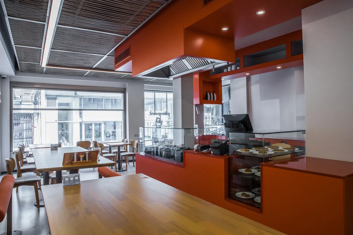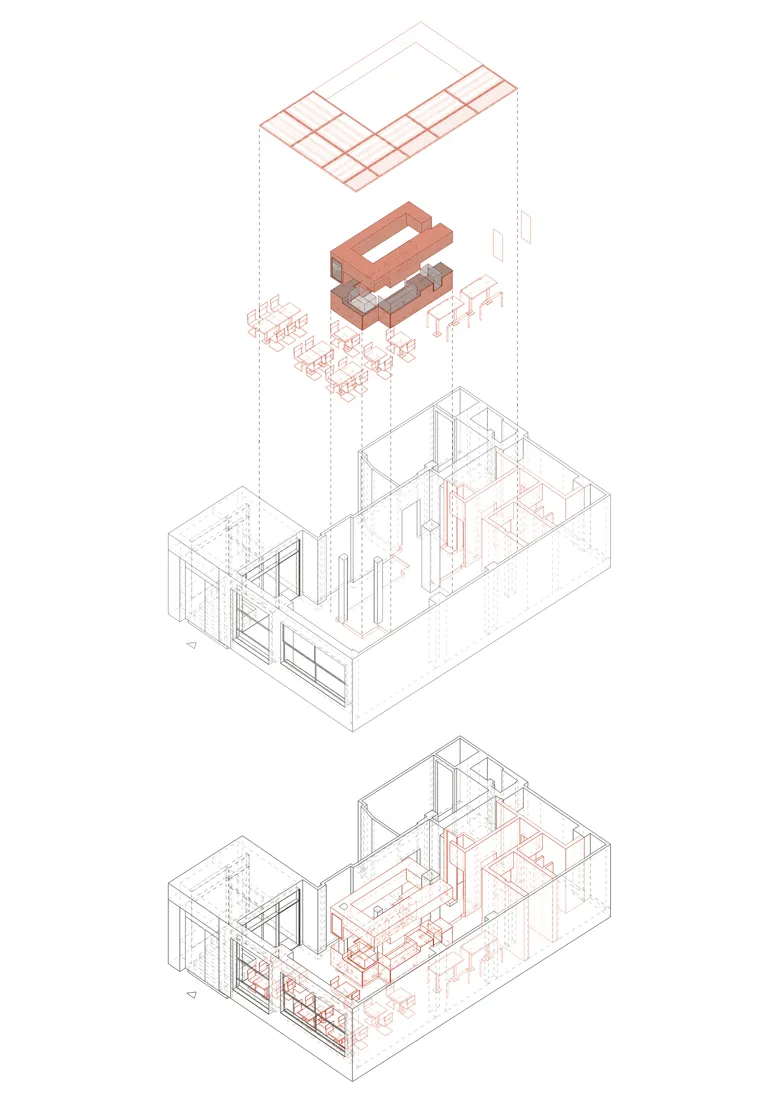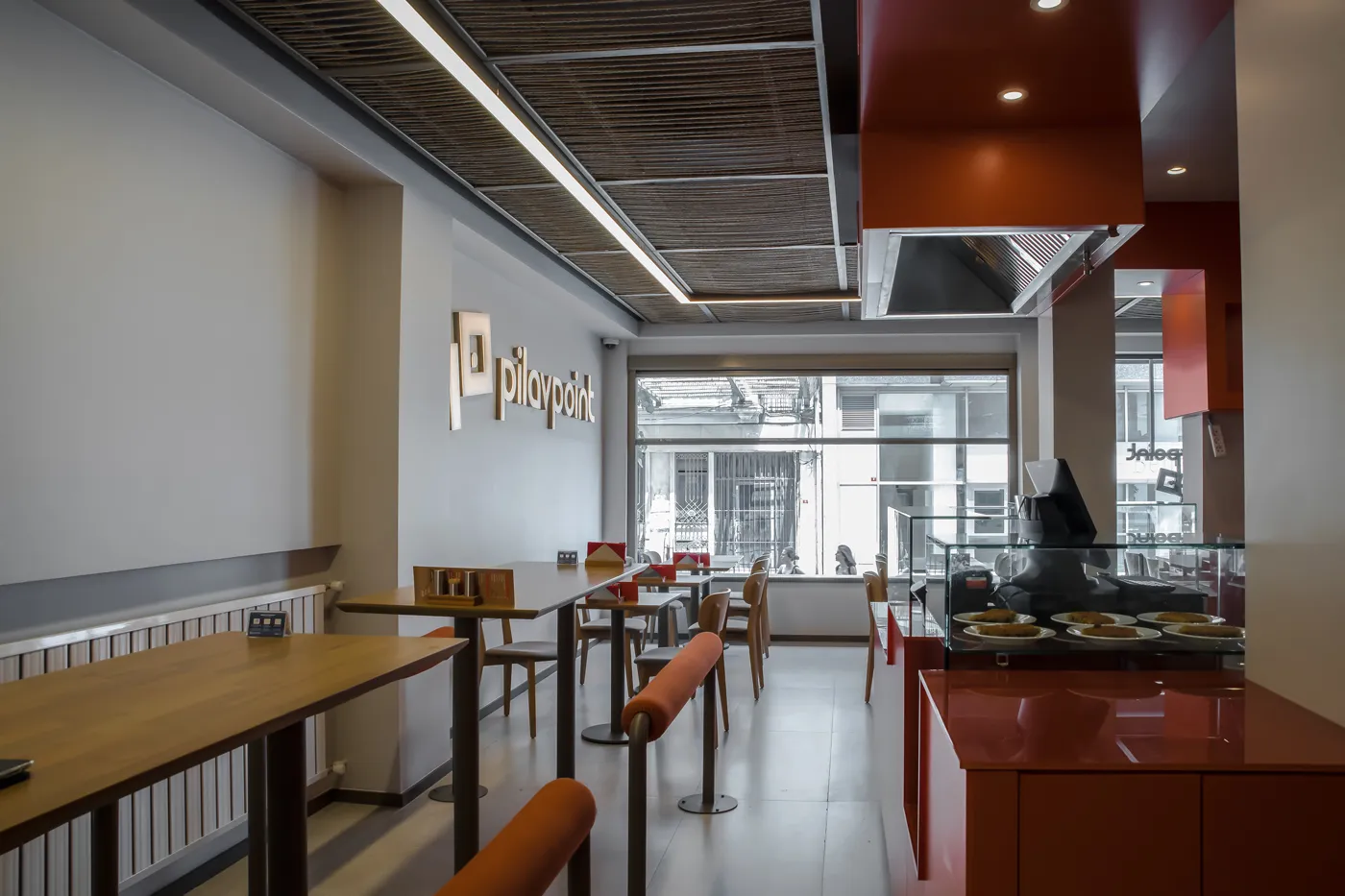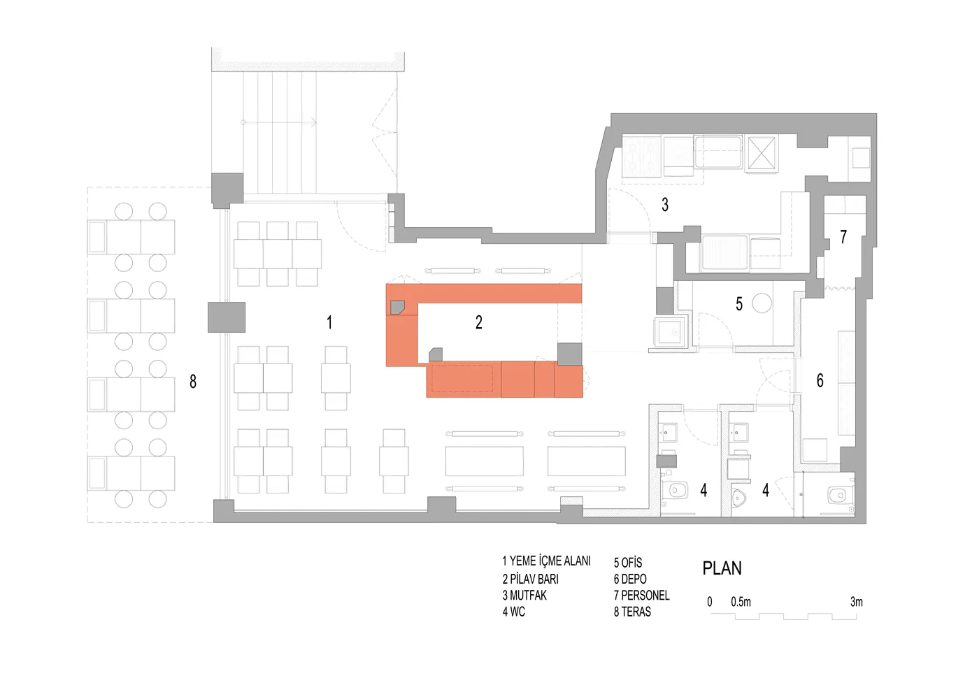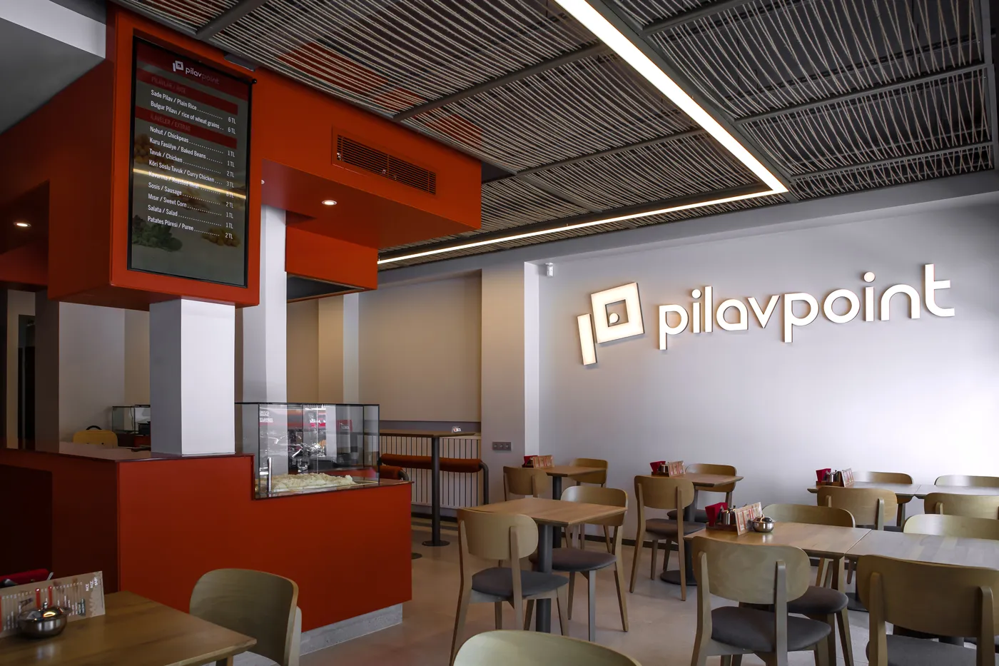 Mevcut mekanın parçalanmışlığına karşın; öncelikle homojen bir hacim yaratılarak bütüncül bir mekan algısının oluşması amaçlanmıştır. Bunun için ana hacimi oluşturan yüzeylerde yakın renk tonlarında farklı malzemeler kullanılmış, ip tavan gibi özel imalatlarla doku çeşitliliği sağlanmıştır. Taşıyıcı sistemin yoğun olduğu bölümde bir “pilav barı” oluşturularak alan kullanımı rahatlatılmış ve fonksiyon dağılımı tanımlı bir şekilde çözümlenmiştir. “Pilav barı” servis, yeme-içme, teşhir, soğutma sistemi, depolama fonksiyonları ile donatılarak aynı zamanda kurumsal yapıdaki “point” kavramını da karşılayan merkez rolünü üstlenmiştir.