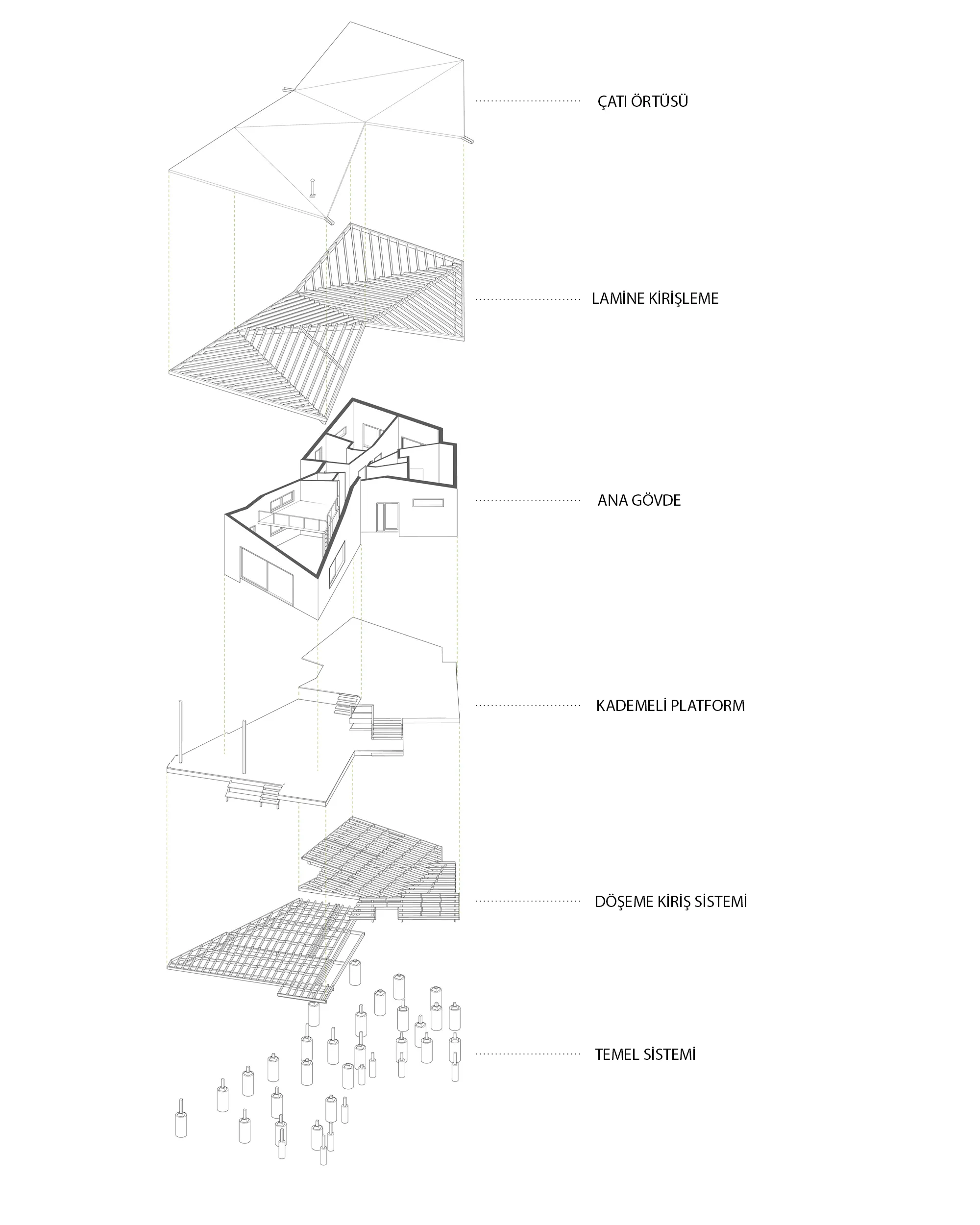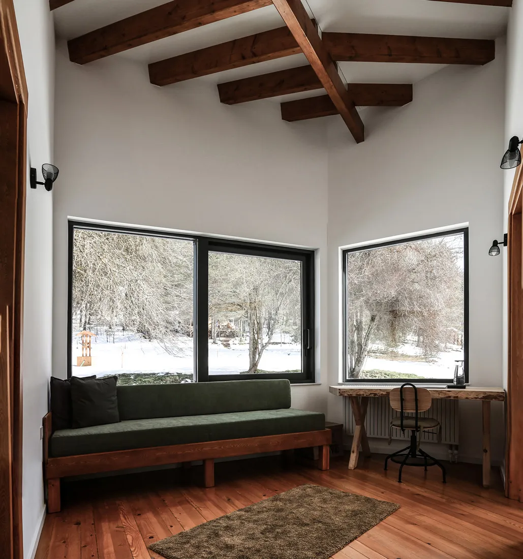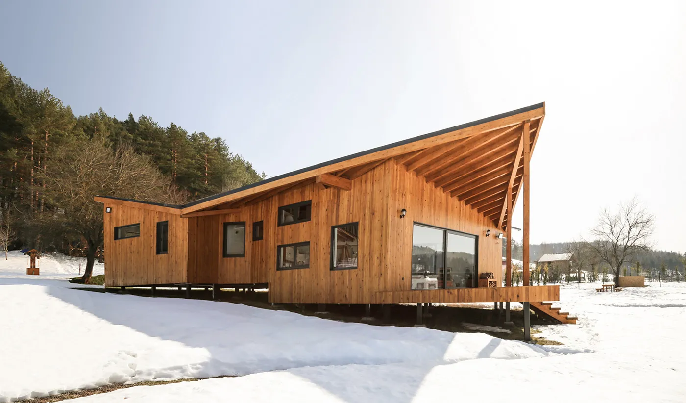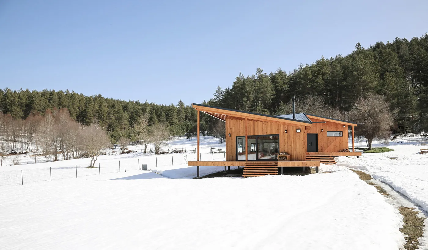 İznik’in dağlık bölgesinde konumlanan hafta sonu evi, içinde bulunduğu coğrafya ile ilişkilendirilerek yeşil yamaçların uzantısında ahşap bir yapı olarak tasarlanmıştır. Çam ve kayın ormanlarıyla çevrelenen geniş boşluğun, yoldan en uzak noktasında konumlandırılmıştır. Böylece yapıya yaklaşım senaryosunda yürüme eylemi tasarımın bir parçası haline getirilmiştir. Yoldan yapıya kadar olan mesafenin doğanın yoğun olarak hissedildiği bir patika olarak kurgulanması ile yapının, arka fondaki orman dokusu ile bir bütün olarak algılanması amaçlanmıştır. Proje alanını sınırlandıran ormanlık bölge içinde doğal bir patikaya dönüşen yürüme hattı, yerleşim kararını etkileyen temel unsur olmuştur. Yapı, bu yürüme ekseni üzerine oturan ve söz konusu hattın iç mekanda da devam ettirildiği, böylece doğal peyzajın evin hemen hemen her noktasından hissedilir olduğu bir ana fikir çerçevesinde çözümlenmiştir.