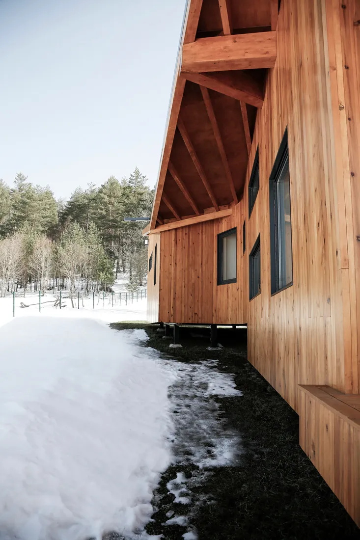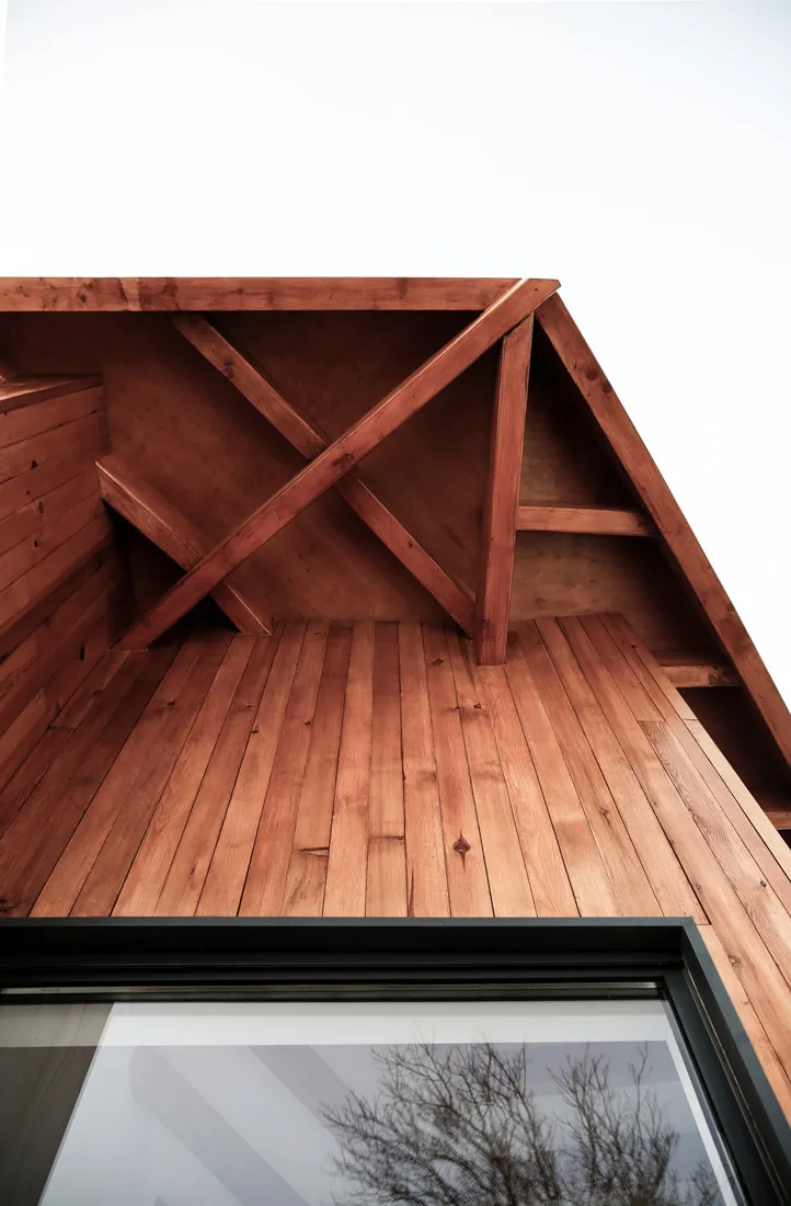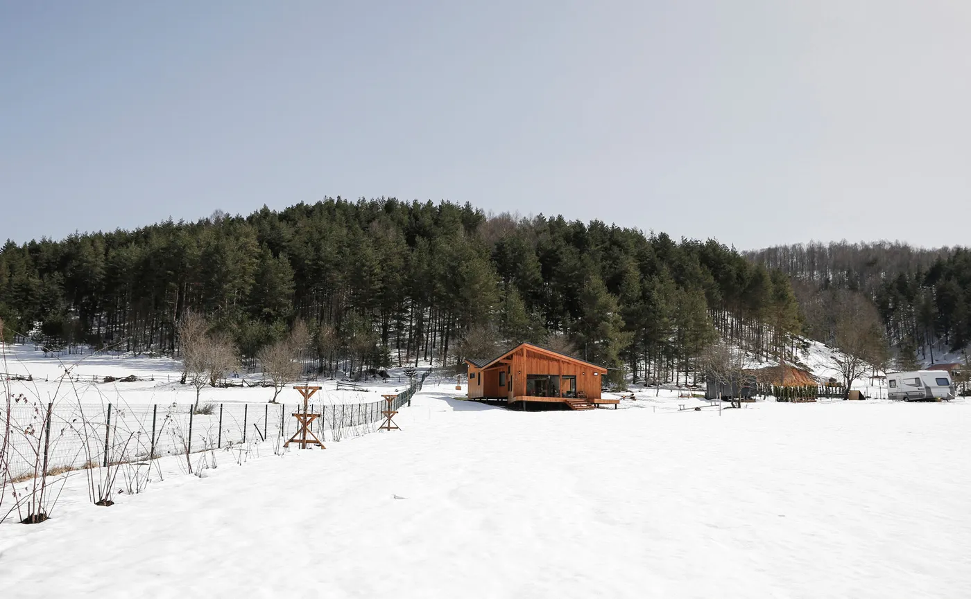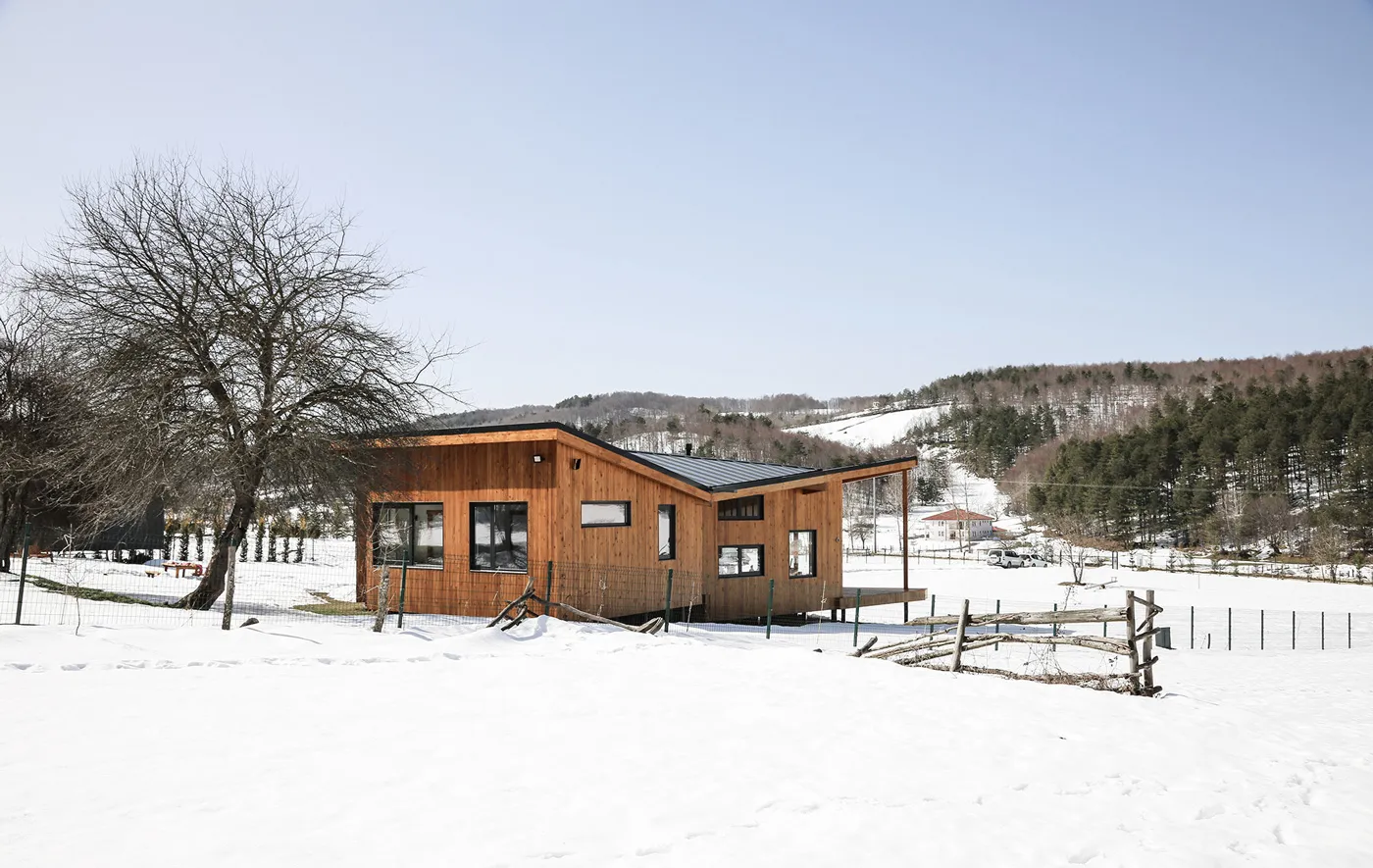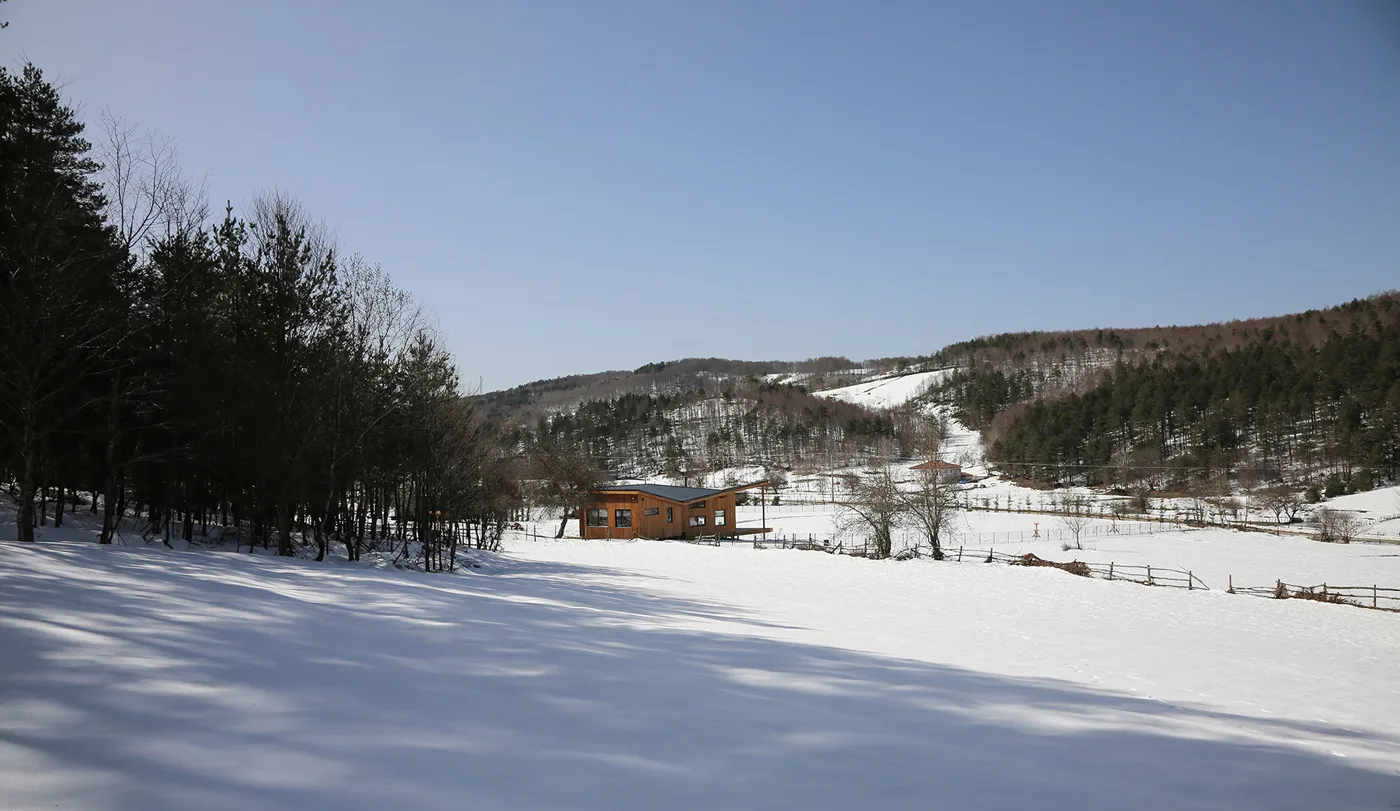 İznik’in dağlık bölgesinde konumlanan hafta sonu evi, içinde bulunduğu coğrafya ile ilişkilendirilerek yeşil yamaçların uzantısında ahşap bir yapı olarak tasarlanmıştır. Çam ve kayın ormanlarıyla çevrelenen geniş boşluğun, yoldan en uzak noktasında konumlandırılmıştır. Böylece yapıya yaklaşım senaryosunda yürüme eylemi tasarımın bir parçası haline getirilmiştir. Yoldan yapıya kadar olan mesafenin doğanın yoğun olarak hissedildiği bir patika olarak kurgulanması ile yapının, arka fondaki orman dokusu ile bir bütün olarak algılanması amaçlanmıştır. Proje alanını sınırlandıran ormanlık bölge içinde doğal bir patikaya dönüşen yürüme hattı, yerleşim kararını etkileyen temel unsur olmuştur. Yapı, bu yürüme ekseni üzerine oturan ve söz konusu hattın iç mekanda da devam ettirildiği, böylece doğal peyzajın evin hemen hemen her noktasından hissedilir olduğu bir ana fikir çerçevesinde çözümlenmiştir.