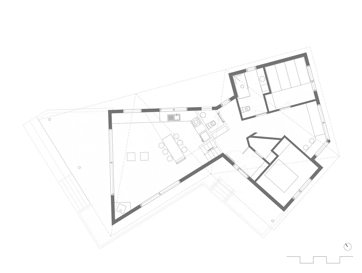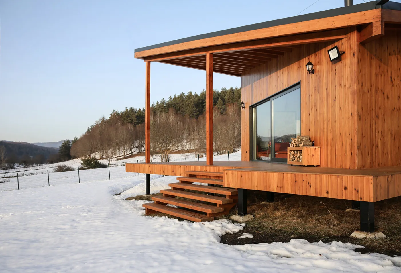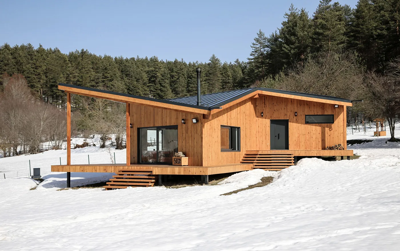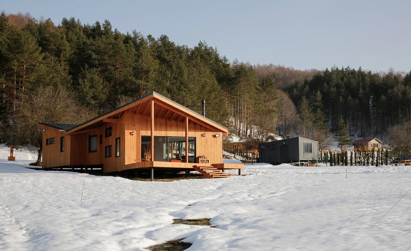İznik’in dağlık bölgesinde konumlanan hafta sonu evi, içinde bulunduğu coğrafya ile ilişkilendirilerek yeşil yamaçların uzantısında ahşap bir yapı olarak tasarlanmıştır. Çam ve kayın ormanlarıyla çevrelenen geniş boşluğun, yoldan en uzak noktasında konumlandırılmıştır. Böylece yapıya yaklaşım senaryosunda yürüme eylemi tasarımın bir parçası haline getirilmiştir. Yoldan yapıya kadar olan mesafenin doğanın yoğun olarak hissedildiği bir patika olarak kurgulanması ile yapının, arka fondaki orman dokusu ile bir bütün olarak algılanması amaçlanmıştır. Proje alanını sınırlandıran ormanlık bölge içinde doğal bir patikaya dönüşen yürüme hattı, yerleşim kararını etkileyen temel unsur olmuştur. Yapı, bu yürüme ekseni üzerine oturan ve söz konusu hattın iç mekanda da devam ettirildiği, böylece doğal peyzajın evin hemen hemen her noktasından hissedilir olduğu bir ana fikir çerçevesinde çözümlenmiştir.