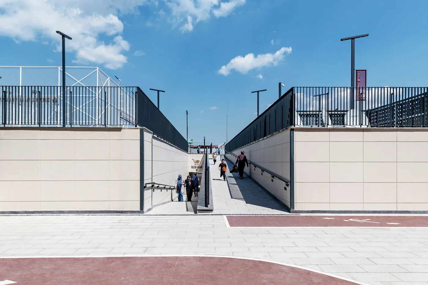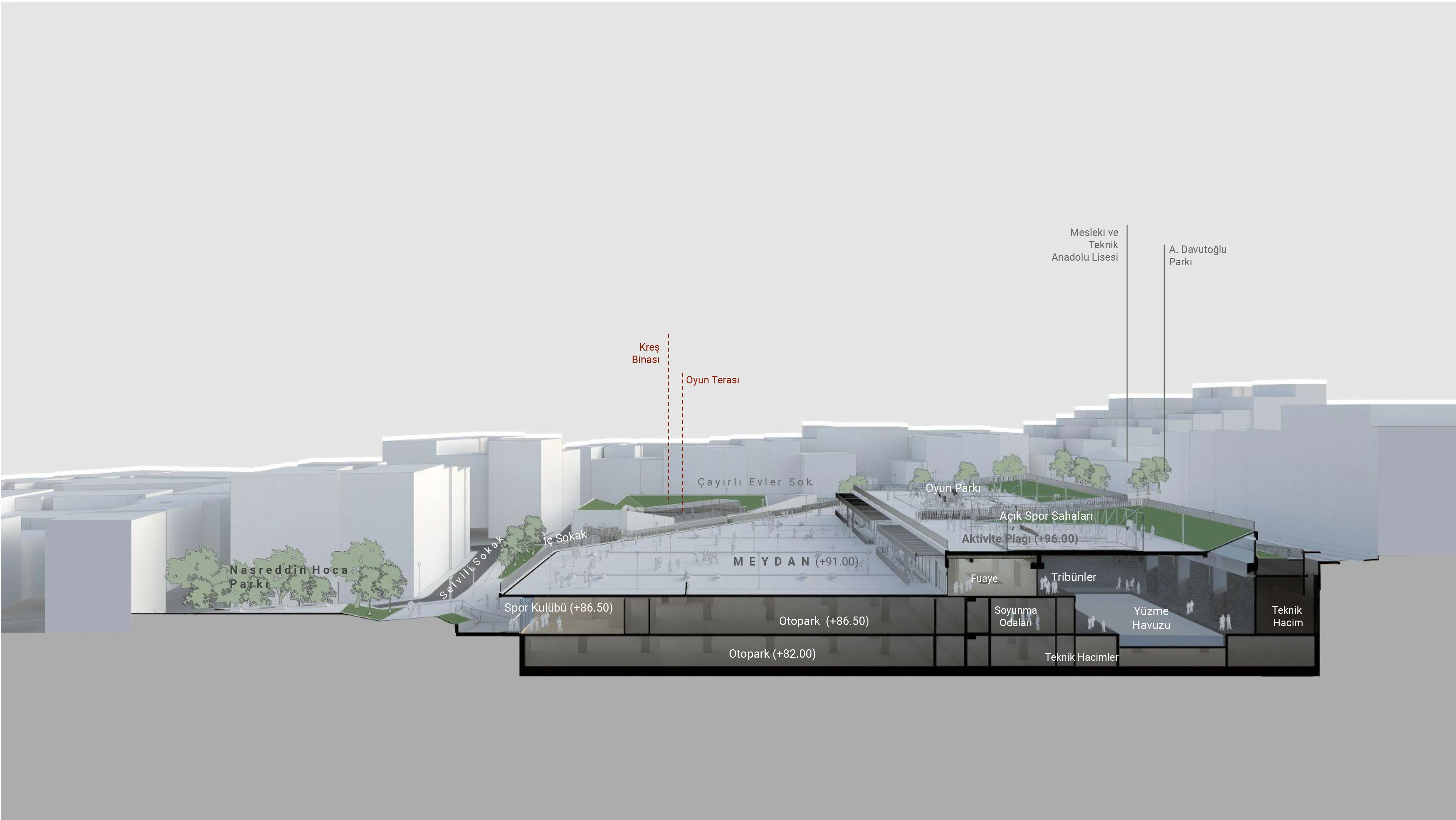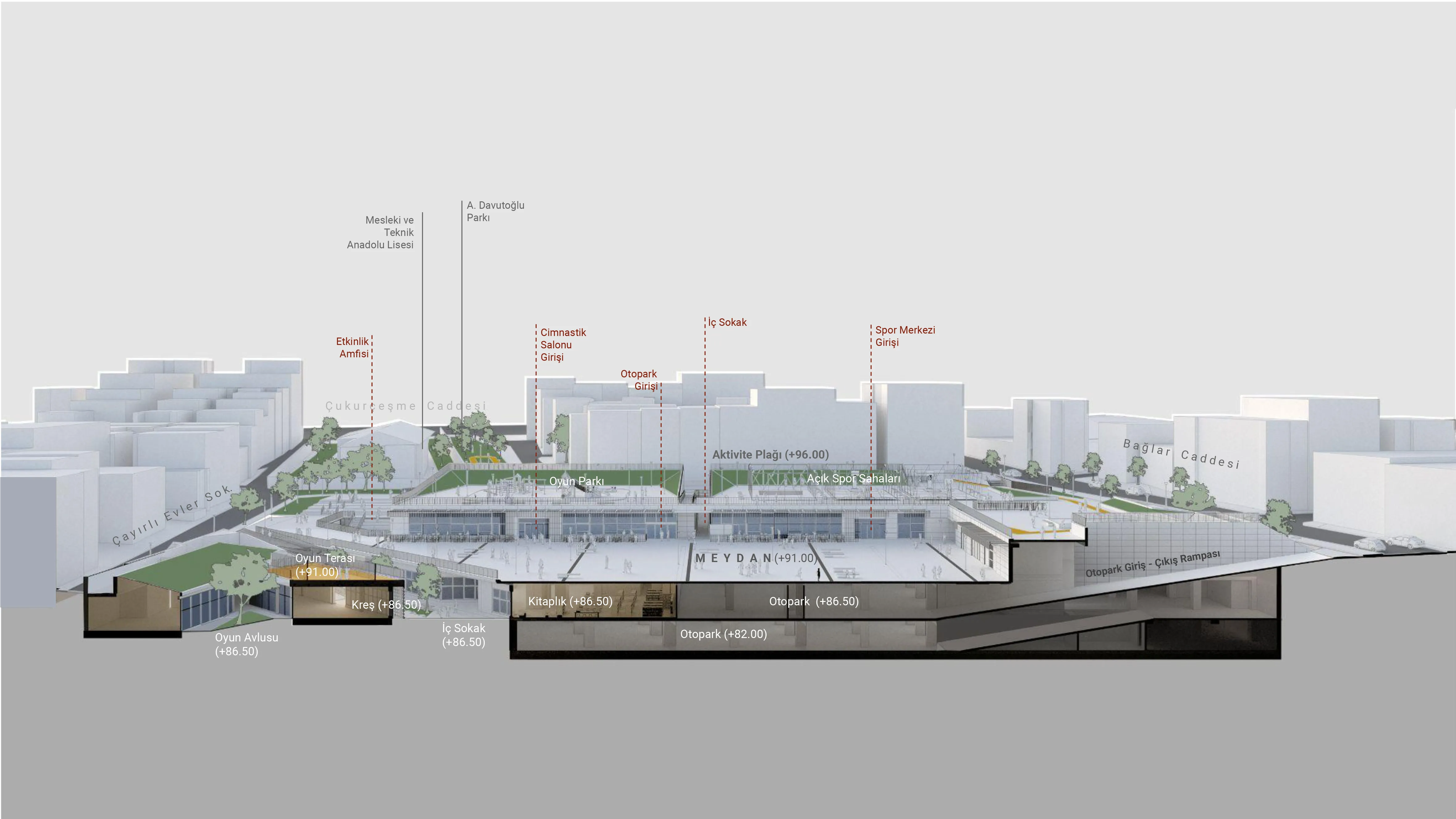 Eğimli topografik yapıya uyumlu olarak planlanan kademelendirilmiş plaklar (aktivite, meydan, eğitim-kültür) ve bu plakları birbirine bağlayan iç sokaklar ile kentsel bağlantılar kesintisiz bir sirkülasyon ağı oluşturacak biçimde kurulmuştur. Spor Merkezi ana girişleri, mahalle evi ve geçici pazar yerinin konumlandığı ‘’meydan’’ alan içinde köşe kotları tutan diagonal bir sirkülasyon hattı üzerine oturmaktadır. Bu duruma koşut olarak alanın alt kot sınırını oluşturan Selvili Sokak yayalaştırılmış; kreş, kitaplık, kafeterya ve etkinlik amfisi bağlantılarının kurulduğu dingin bir iç sokak ile alan içinde sürekliliği sağlanarak yaya erişim senaryosu güçlendirilmiştir.